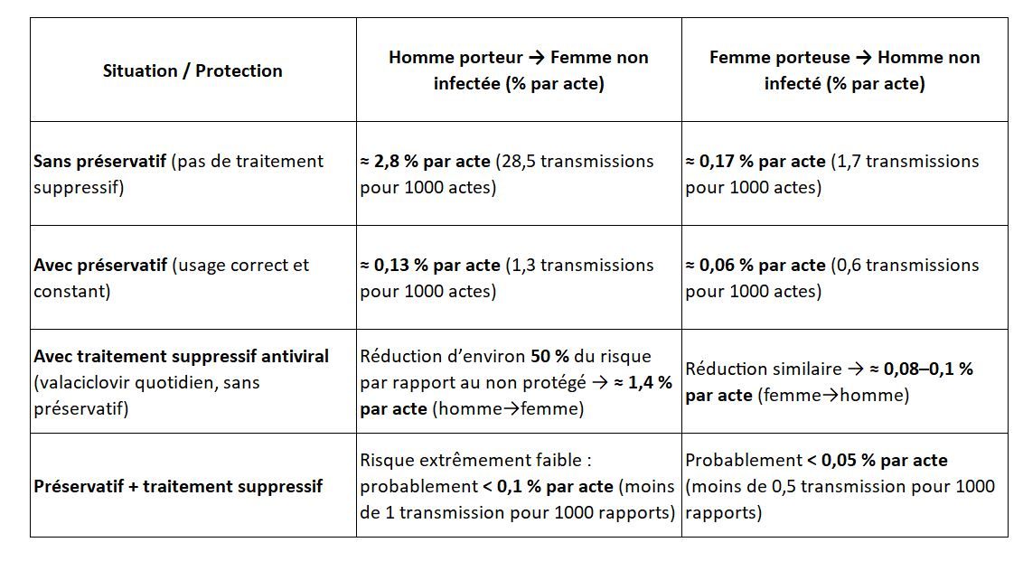 - Réduction documentée de la transmission : l’essai pivot dirigé par L. Corey et al. (NEJM, 2004) a montré qu’un traitement suppressif par valaciclovir réduit significativement le risque de transmission chez des couples hétérosexuels discordants.